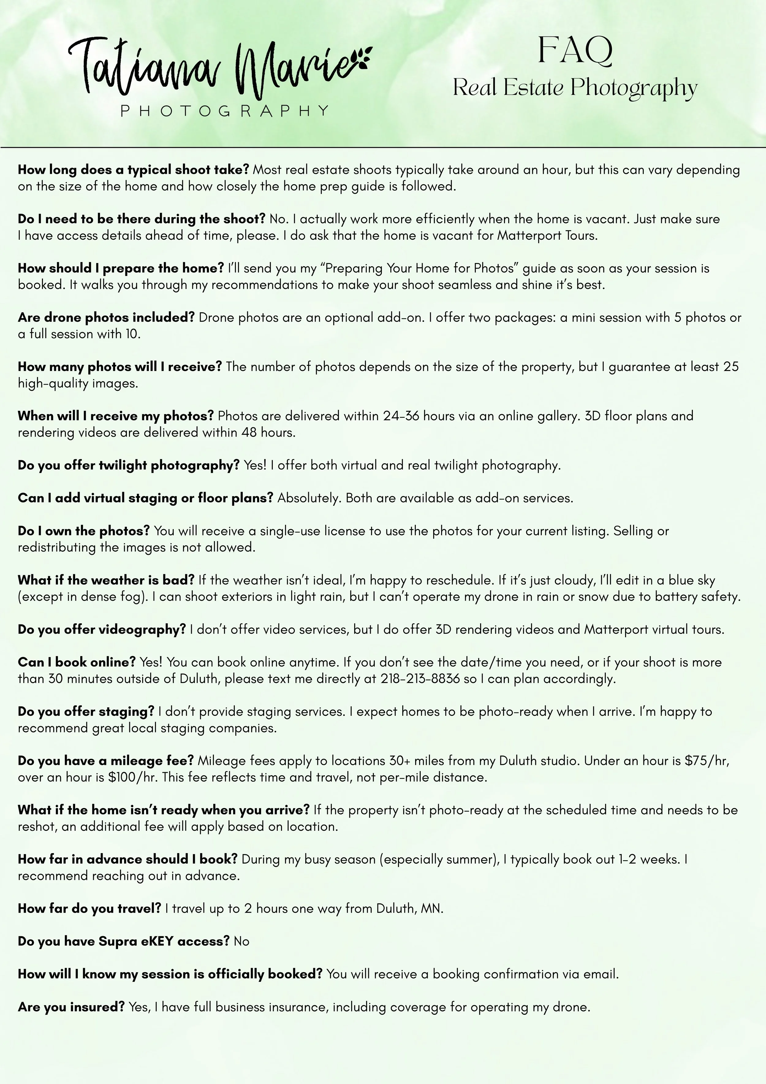 Please fill out my contact form if you have additional questions or would like to schedule a shoot. You may also book your session under the “Real Estate Booking” tab.